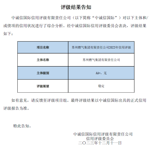 日前,經(jīng)國(guó)內(nèi)權(quán)威信用評(píng)級(jí)機(jī)構(gòu)——中誠(chéng)信國(guó)際信用評(píng)級(jí)有限責(zé)任公司評(píng)定,蘇州能源集團(tuán)子公司燃?xì)饧瘓F(tuán)主體信用等級(jí)為AA+,評(píng)級(jí)展望為穩(wěn)定。