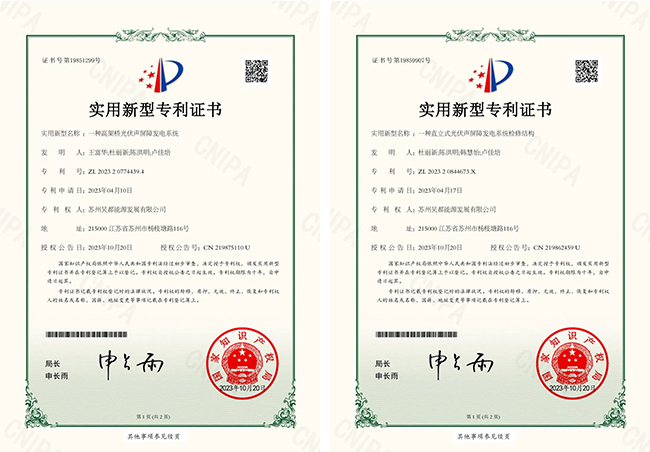 在光伏聲屏障技術(shù)研發(fā)和方案設(shè)計過程中,能源集團(tuán)下屬吳都能源公司組建專班,對主材選配、工藝定制、性能測試、安全評定、施工安裝、設(shè)備調(diào)試等方面進(jìn)行了反復(fù)論證、驗證,最終量身定制了特殊規(guī)格主材并制定最佳技術(shù)實施路線,實現(xiàn)了項目順利落地?!兑环N直立式光伏聲屏障發(fā)電系統(tǒng)檢修結(jié)構(gòu)》《一種高架橋光伏聲屏障發(fā)電系統(tǒng)》,獲得了國家實用新型專利,為同行同類項目提供了重要的參考價值和落地經(jīng)驗。