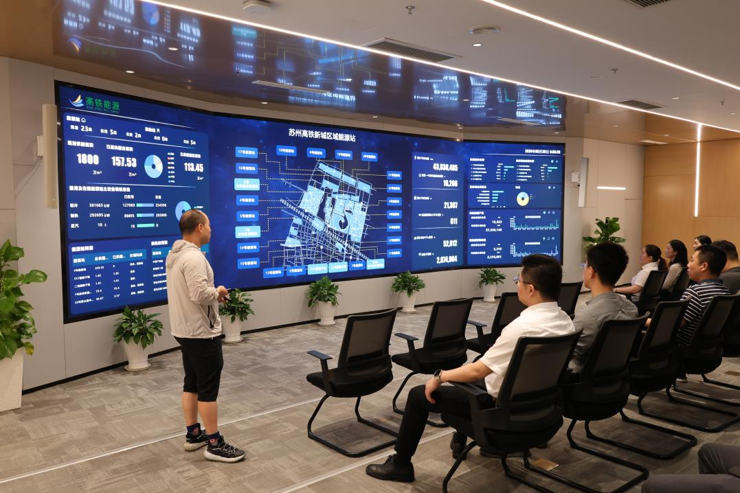 能源青年首先到達(dá)高鐵新城啟動(dòng)區(qū)能源站參觀。能源站位于長(zhǎng)三角國(guó)際研發(fā)社區(qū)內(nèi),是蘇州高鐵新城能源示范項(xiàng)目,總供能建筑面積約75萬(wàn)平方米。該能源站以電能和市政蒸汽為初始能源,向周邊建筑群統(tǒng)一提供供暖供冷服務(wù)。通過(guò)現(xiàn)場(chǎng)觀摩綜合能源信息化平臺(tái),能源青年對(duì)智能化、綜合化的能源服務(wù)新模式有了更深的了解。