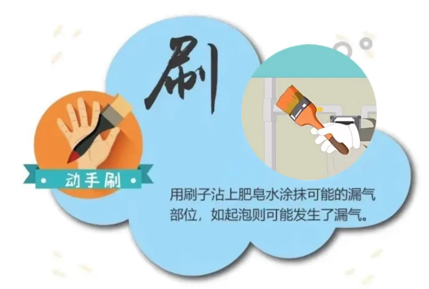 用刷子沾上肥皂水涂抹可能漏氣的部位,如起泡則可能發(fā)生了漏氣。