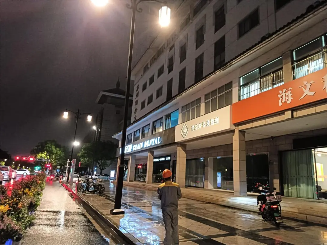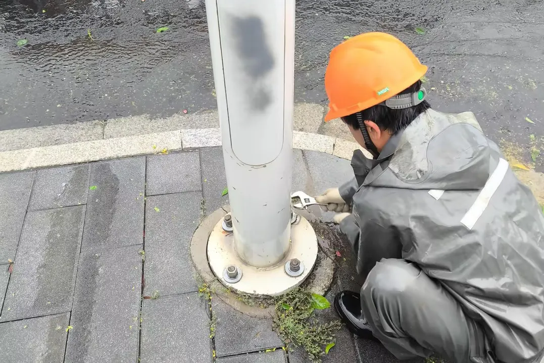 采用網(wǎng)格化巡檢,建立針對性應急機制,對所轄照明設(shè)施、在建項目進行全面排查,特別是大型宮燈、路燈桿、配電箱、廣告燈箱、低洼臨水區(qū)域照明設(shè)施等關(guān)鍵部位,確保穩(wěn)固無松動。檢查并清理配電箱、計控箱周邊積水,防止造成設(shè)施損壞或觸電風險。受臺風影響,個別燈具、燈桿被傾倒的樹枝、圍墻壓壞,搶修人員接報后立即至現(xiàn)場拆除更換,并采取加固措施,避免產(chǎn)生次生事故。