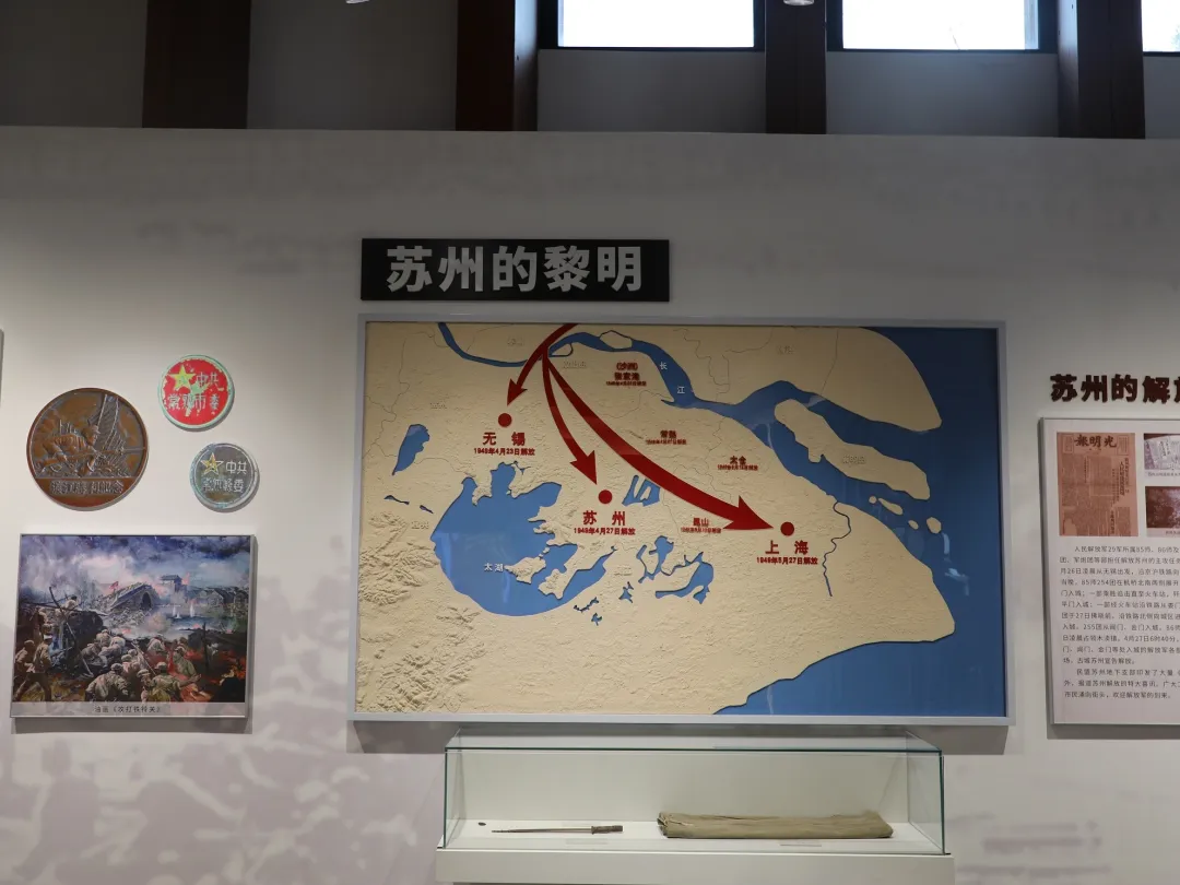 隨后,一行人來到了雙山島渡江戰(zhàn)役展示館。該館作為蘇州市黨性教育基地之一,以“千里渡江最東端,蘇州解放第一槍”為主題,詳細記載了沙洲人民與解放軍在解放戰(zhàn)爭時期共同參與渡江戰(zhàn)役的歷史。館內(nèi)的五個展區(qū)詳細展示了沙洲人民在解放戰(zhàn)爭中發(fā)揮的重要作用,特別是在后勤支持和情報工作方面的無私奉獻。這些革命事跡不禁讓人肅然起敬,激勵著在場的每一位學員。