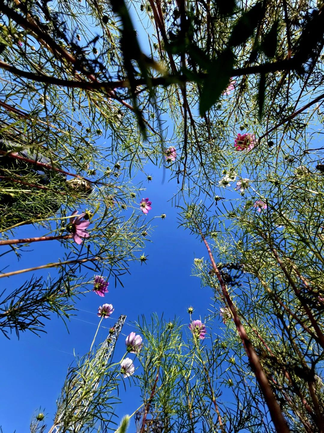 照片捕捉了從低處仰望天空的視角。盛開的花朵點綴在綠色的枝葉之間。晴朗的天空為背景,賦予了畫面一種寧靜和諧美。象征著在日常生活忙碌之余,讓我們抬頭細(xì)看自然的魅力,感受那片刻的寧靜與和諧。