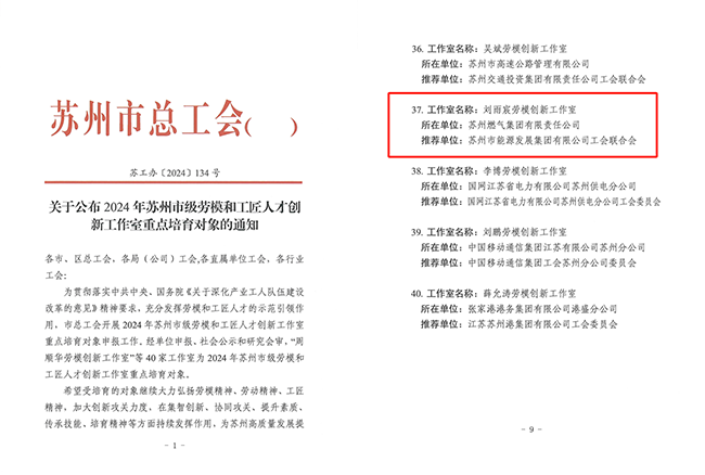 近日,蘇州市總工會發(fā)布《關于公布2024年蘇州市級勞模和工匠人才創(chuàng)新工作室重點培育對象的通知》,集團下屬燃氣集團的劉雨宸勞模創(chuàng)新工作室憑借其在技術創(chuàng)新、人才培養(yǎng)及服務社會等方面的杰出表現(xiàn),成功獲選為2024年蘇州市級勞模和工匠人才創(chuàng)新工作室重點培育對象。