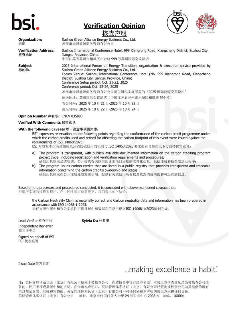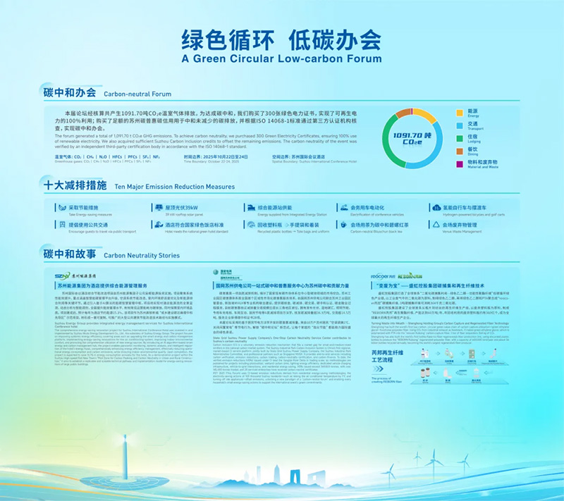 本屆論壇秉承綠色循環(huán)、低碳辦會(huì)理念,通過(guò)采取節(jié)能措施、綠色交通方式、使用循環(huán)再生物料等十大減排措施,最大限度減少碳足跡。論壇通過(guò)采購(gòu)綠色電力證書(shū)實(shí)現(xiàn)可再生電力的100%利用;對(duì)于無(wú)法避免的剩余排放,論壇通過(guò)超10萬(wàn)戶蘇州居民參與的“空調(diào)調(diào)高1℃、關(guān)閉閑置家電”等節(jié)電行為產(chǎn)生的碳普惠減排量進(jìn)行抵消,并根據(jù)ISO 14068-1標(biāo)準(zhǔn)通過(guò)第三方認(rèn)證機(jī)構(gòu)核查,成功實(shí)現(xiàn)“碳中和”辦會(huì)。