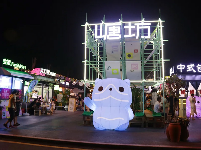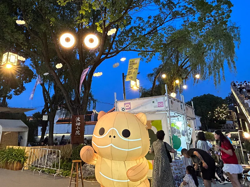 藏身綠意之間的“大眼萌”與山塘靈獸“七貍”IP燈飾,則為整片空間增添趣味互動(dòng)。它們仿佛林中初醒的小精靈,或坐或立,萌態(tài)可掬,點(diǎn)綴在廣場(chǎng)、橋邊、小徑,用光亮為游客送去象征“機(jī)遇、緣分、幸福、健康、富貴、學(xué)識(shí)、優(yōu)雅”的祝愿,喚起人們心底的童真與快樂(lè)。它們與霧靄、星光、云燈交相輝映,為夜晚增添幾分俏皮與夢(mèng)幻,引人駐足流連。