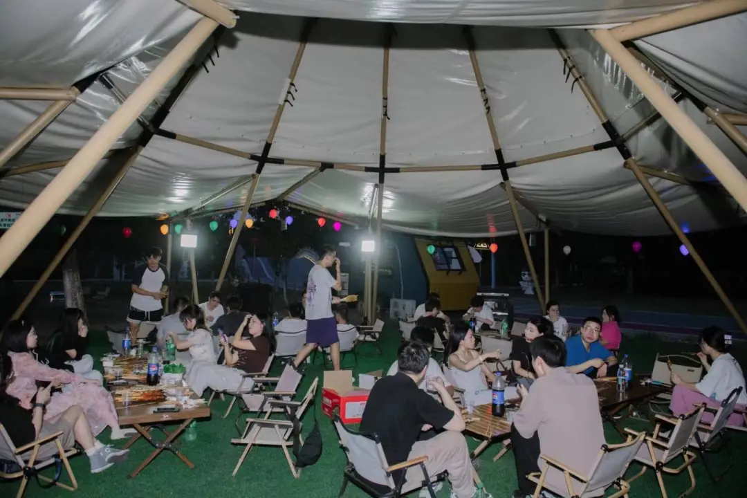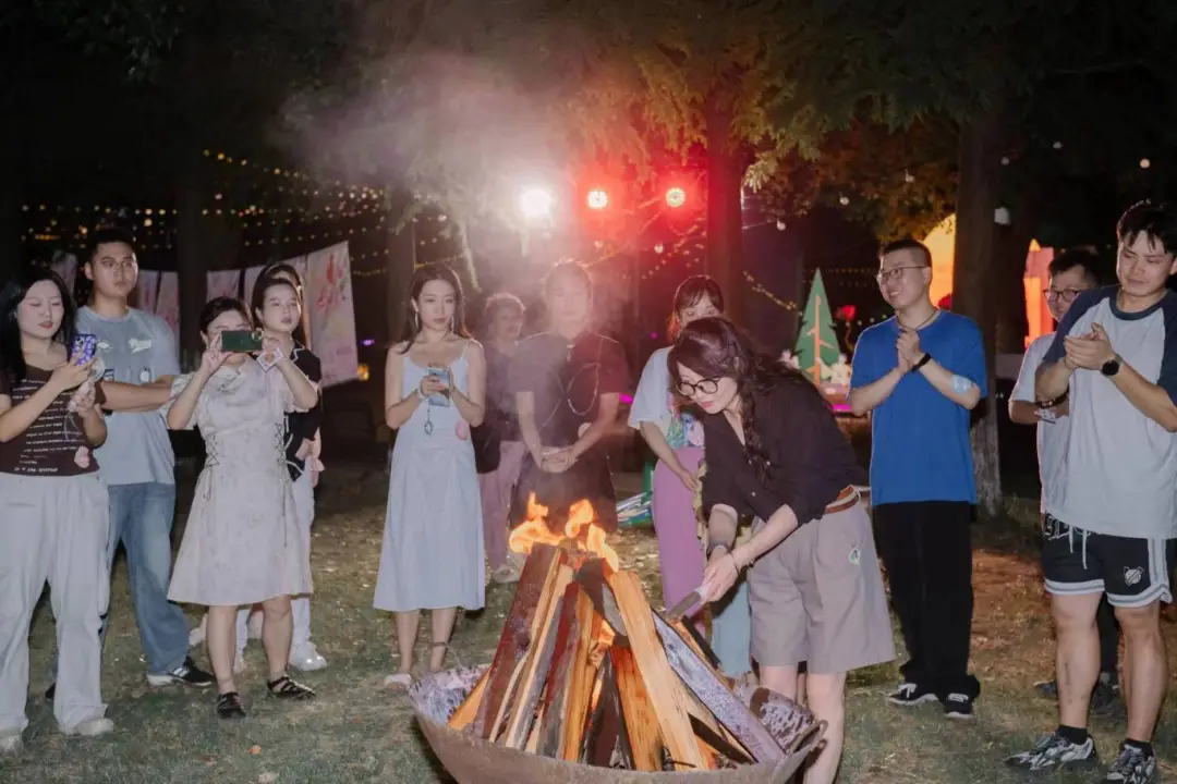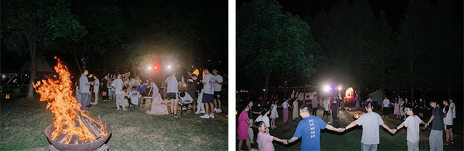 活動尾聲,伴隨著篝火跳動的火苗,吱吱冒響的烤串以及青春飛揚的歌聲,大家手挽手載歌載舞,盡情享受現(xiàn)場的歡樂。
